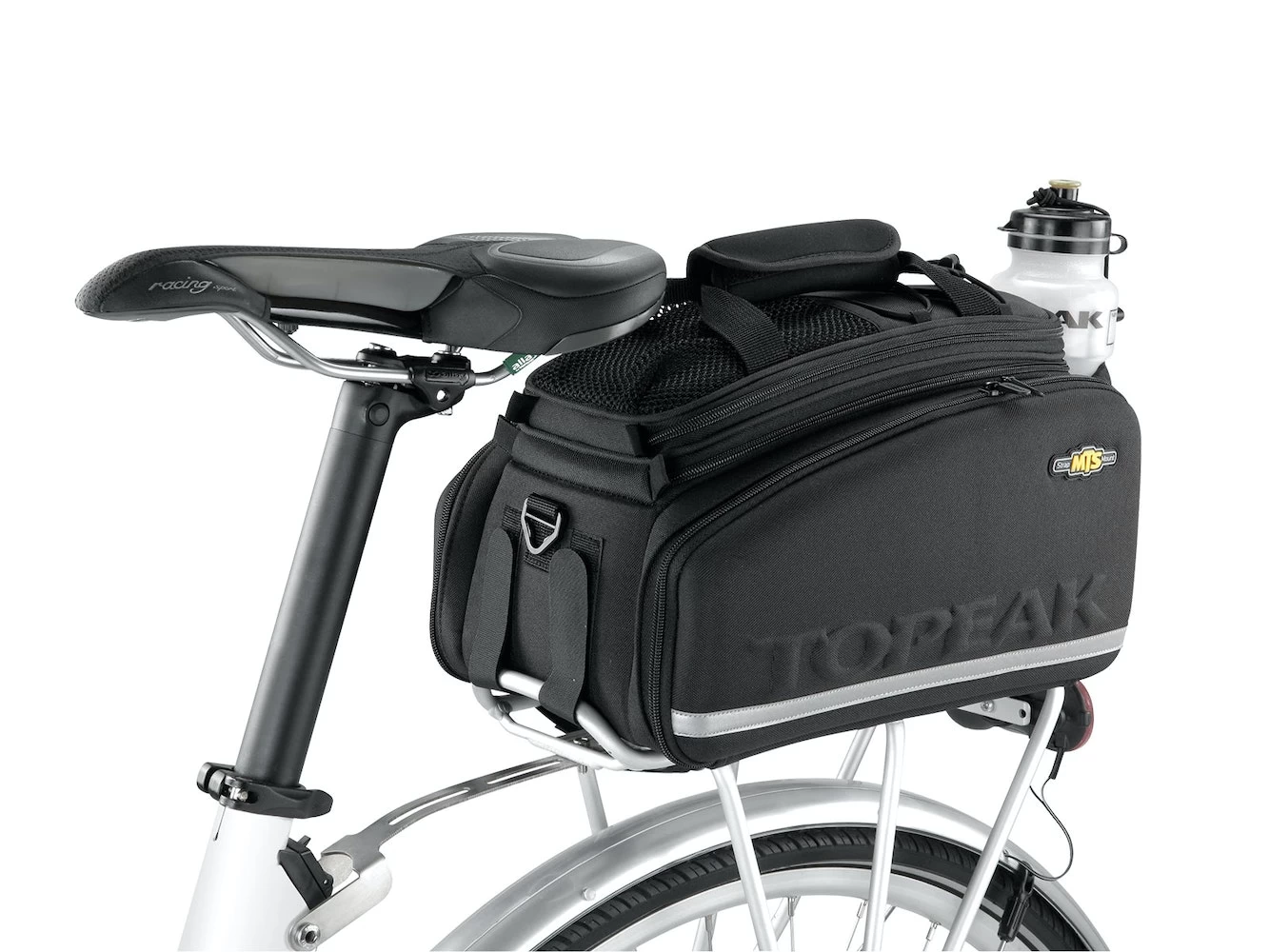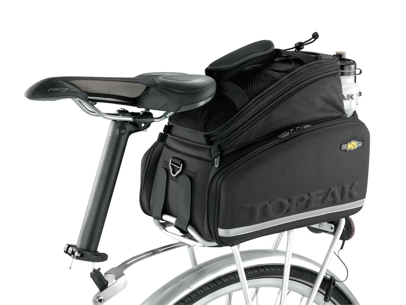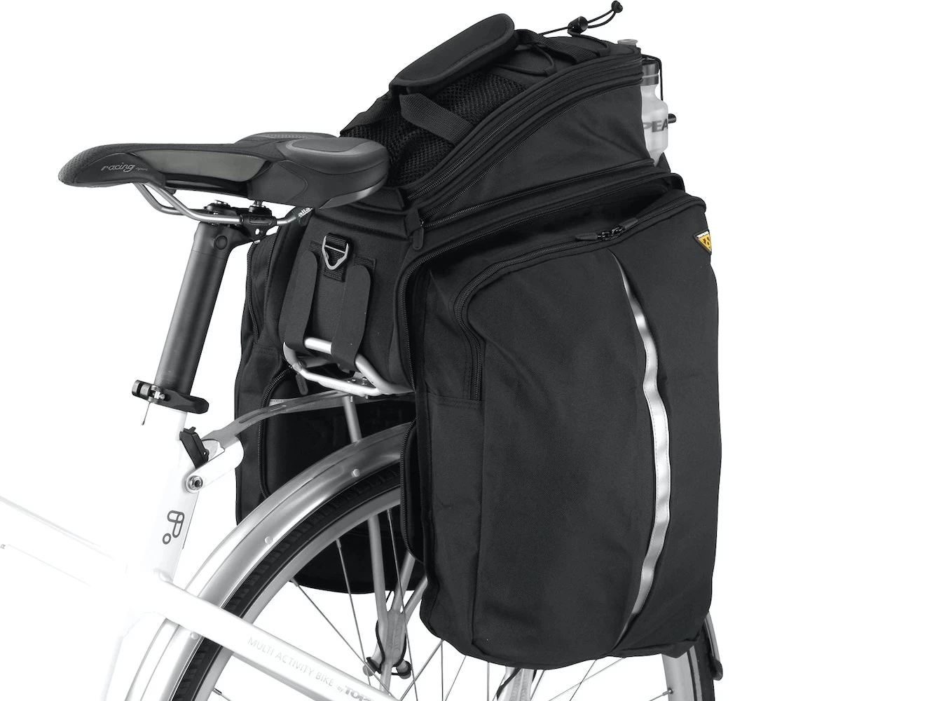 Dual molded side panels combine with flexible 600 denier fabric to form a semi rigid, weather resistant trunkbag. Divided main compartment and side panels expand for extra storage capacity. Rear water bottle holder lets you carry more water on extended trips. Attaches with integrated straps. Pannier deployment requires a beam rack with side frames attached or a traditional rack with struts to prevent panniers from contacting rear wheel.