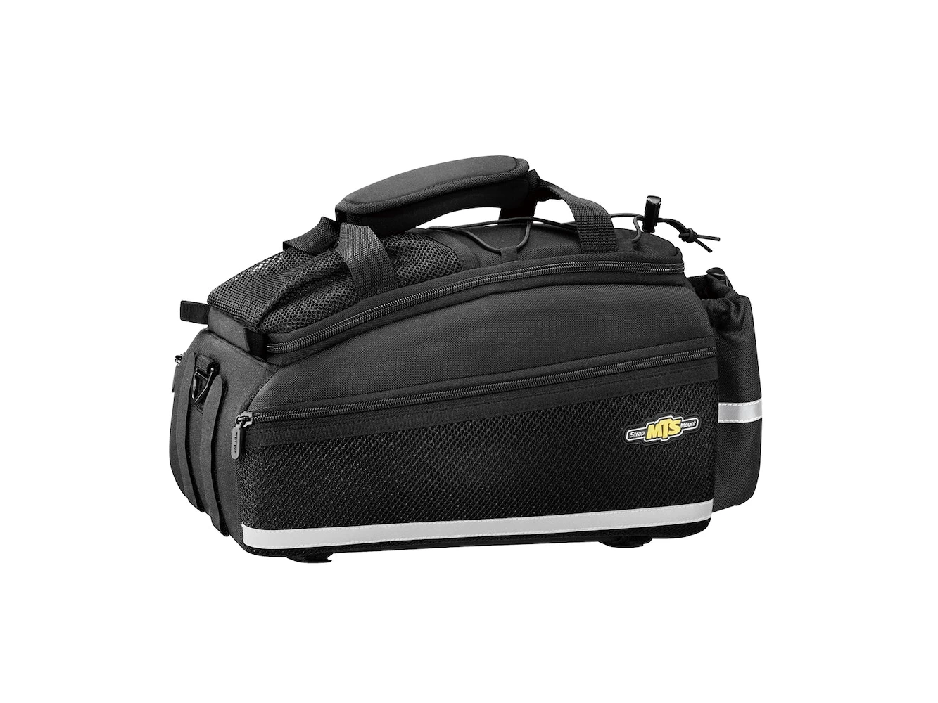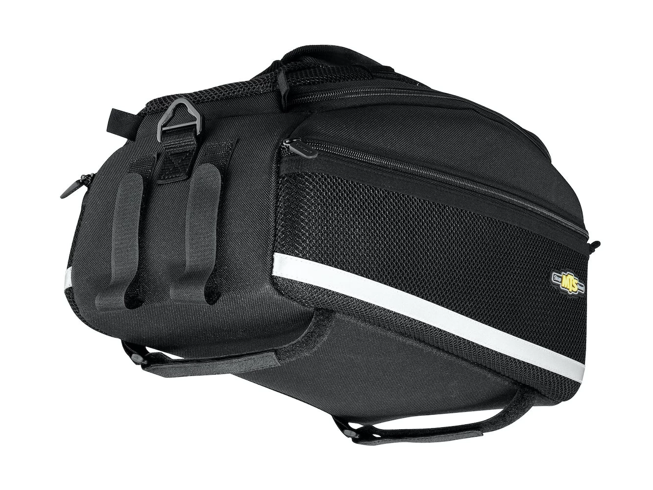 Dual molded side panels combine with flexible 600 denier fabric to form a semi rigid, weather resistant trunkbag. Features a divided main compartment with mesh side compartments and rear water bottle holder. Attaches with integrated straps.