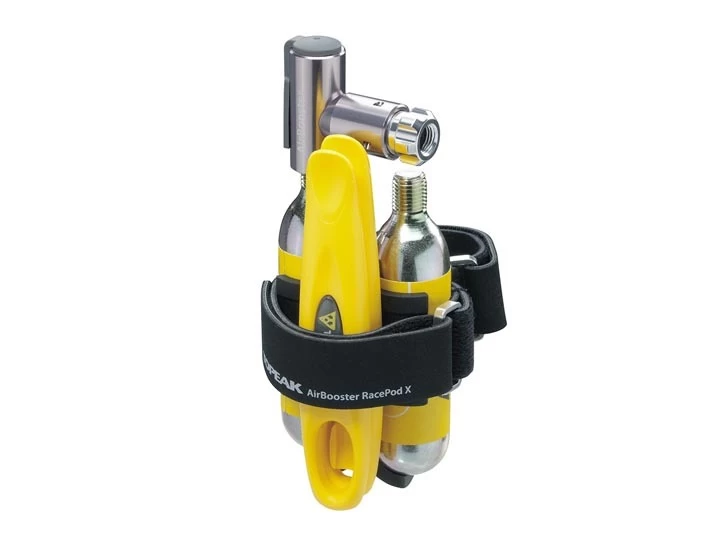The Topeak Airbooster Race Pod X Inflation Kit is a compact and completely self-contained tire inflation kit featuring an AirBooster CO2 inflator, two tire levers, two 16g CO2 cartridges, mounting module with strap.