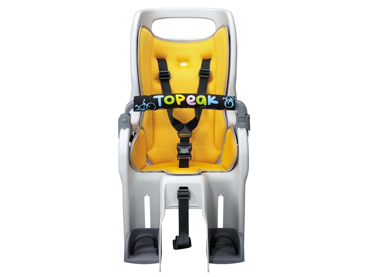 A wrap-around seat structure creates a virtual cocoon of protection and features an updated shoulder harness with a multiple height adjustment system. An innovative suspension system cushions bumps and jolts and the integrated roll bar provides extra head protection and doubles as a carrying handle. Adjustable footrests and straps keep small feet away from spinning wheels. Child seat complies with stringent European, CPSIA and Proposition 65 safety standards.