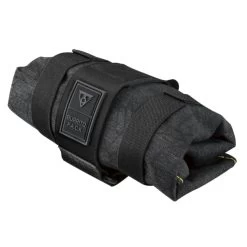 A compact roll-up with three compartments and internal organizers to keep gear and small items neatly in place. The durable water repellent and stain resistant coating keeps contents dry and cleans up easily. Secure strap provides tool-free mounting to frame tube, seat post or to saddle rails.