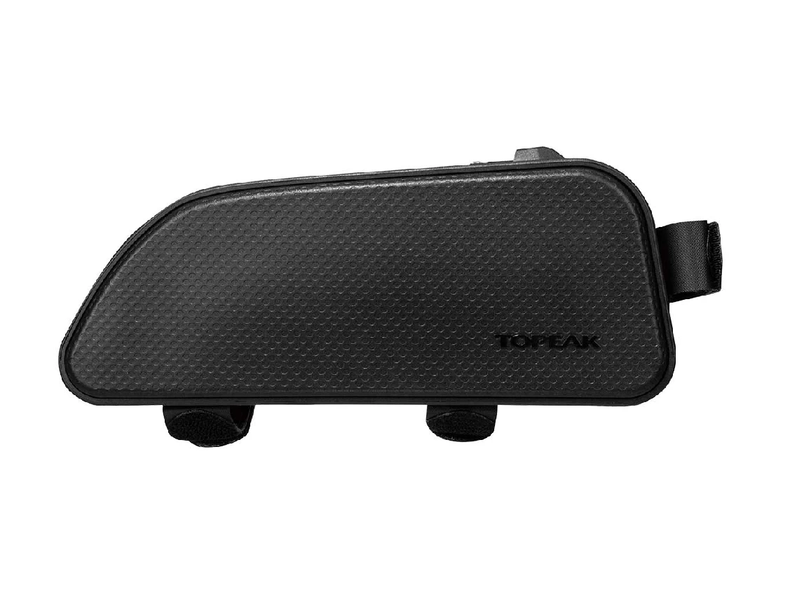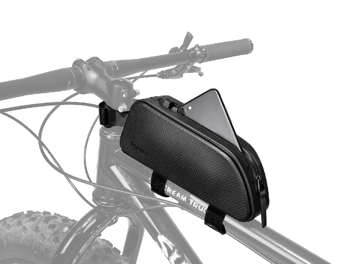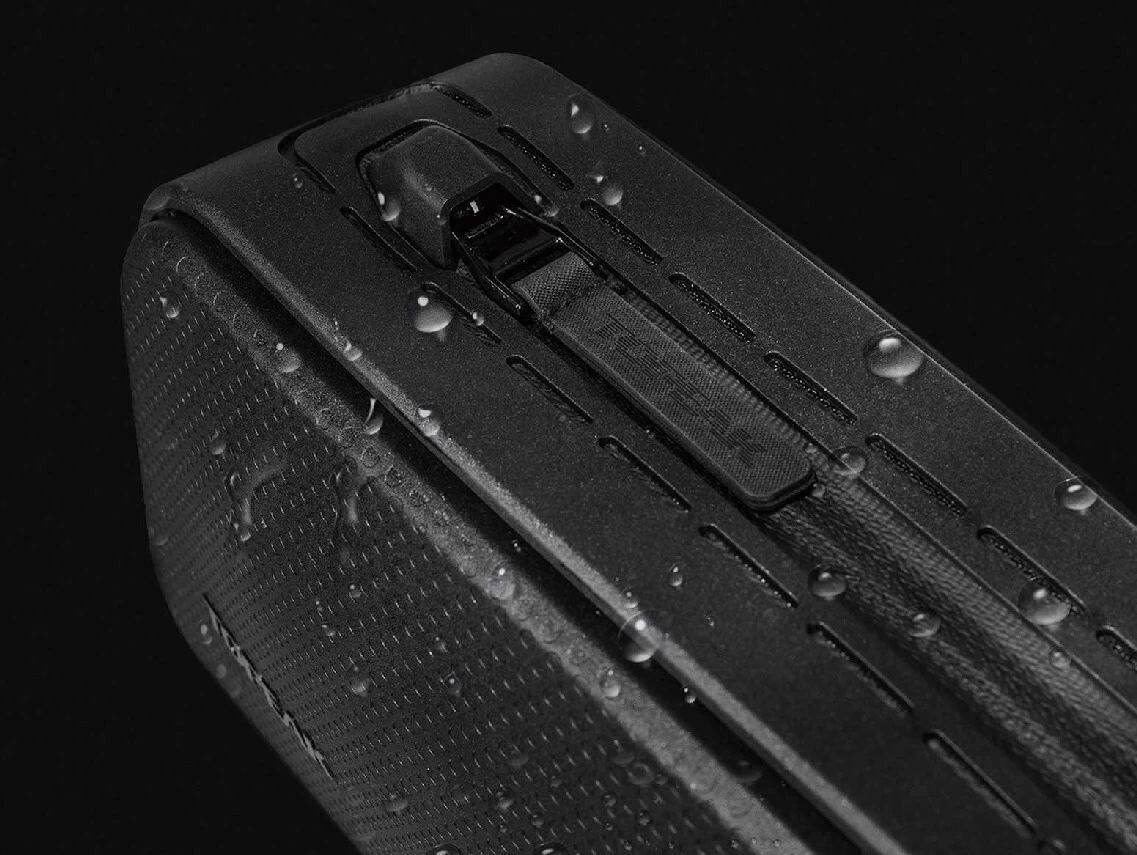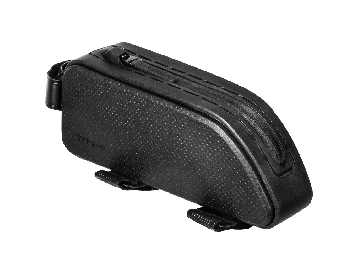 A hard shell, weatherproof top tube mounted bag features a streamlined shape to eliminate leg contact.