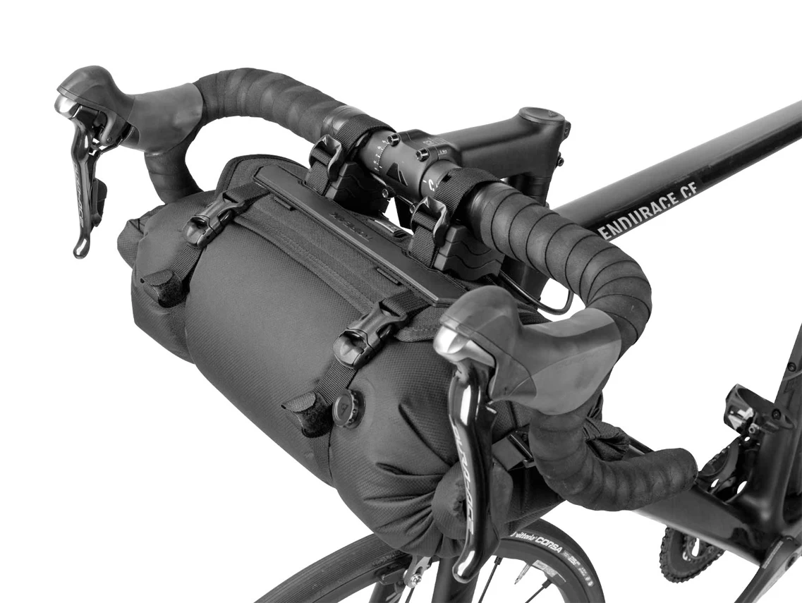 FrontLoader is perfect for carrying light yet bulky items like sleeping bags, camping gear and spare clothing. Featuring a tough outer support harness and constructed of durable abrasion and water resistant materials, it’s easily installed or removed with two straps, special spacer mounts and quick release buckles. A backside head tube strap attachment increases load stability. An 8 liter removable waterproof drybag keeps contents completely protected from wet weather and splashes while a built-in air release button purges unwanted air from the bag to effectively compress its contents.
