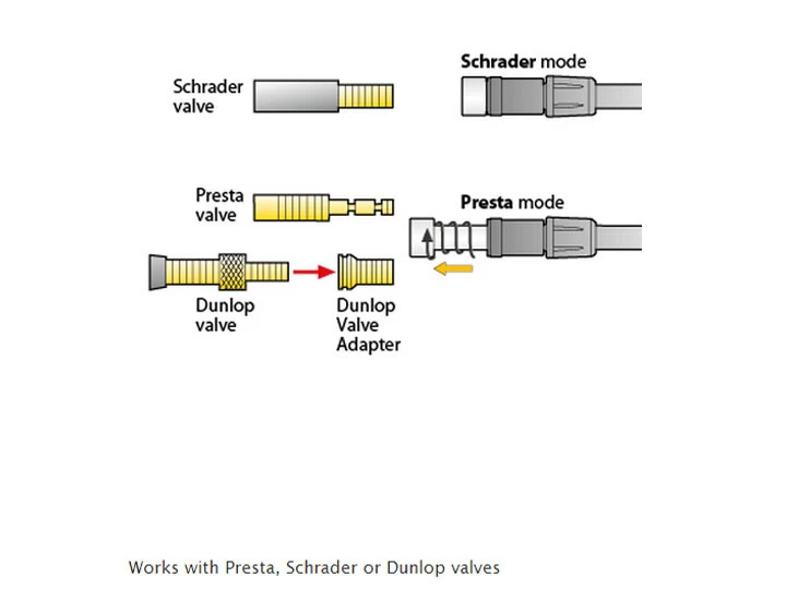 Works with Presta, Schrader or Dunlop valves