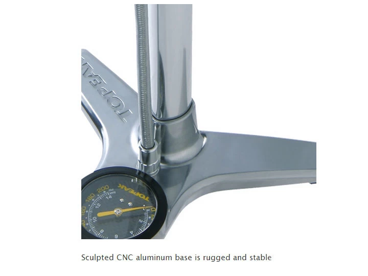 X.O. stands for extraordinary – the only way to describe this newest CNC machined alloy JoeBlow floor pump. An elegant yet modern representation of the classic floor pump, the JoeBlow X.O.’s construction – from its wide stable base to its smoothly shaped handle – is precisely machined and beautifully polished aluminum alloy. Its smooth action and long stroke powers up to 200 psi / 14 bar to fill even the highest pressure track tires. To make tire inflation simple we’ve added our SmartHead ThreadLock hose head which fits Presta and Schrader valves. The machined aluminum base adds maximum stability and an extra-long braided metal hose easily reaches bikes mounted in the workstand.