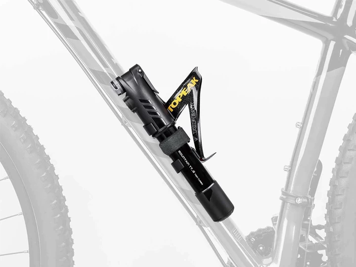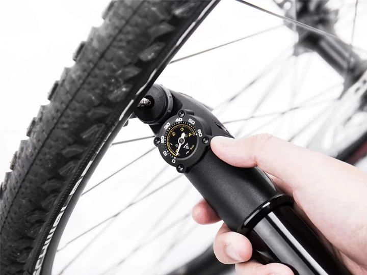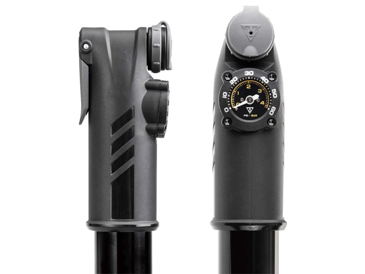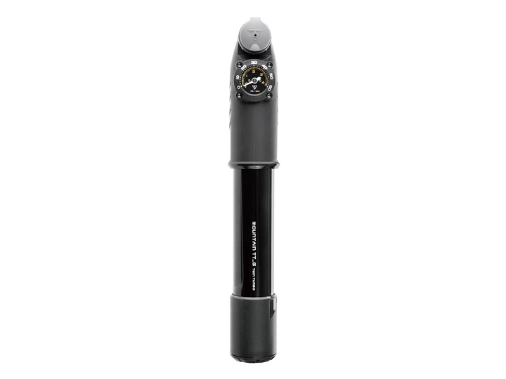 Mountain TT G Twin Turbo with large integrated 1-1/8” diameter easy-to-read analog gauge pump fills both large volume fat bike tires and higher pressure MTB tyres with ease.
