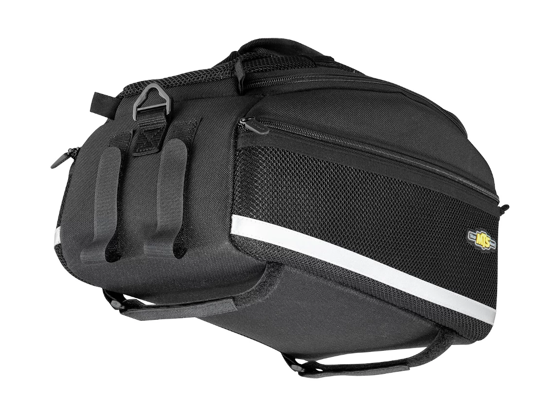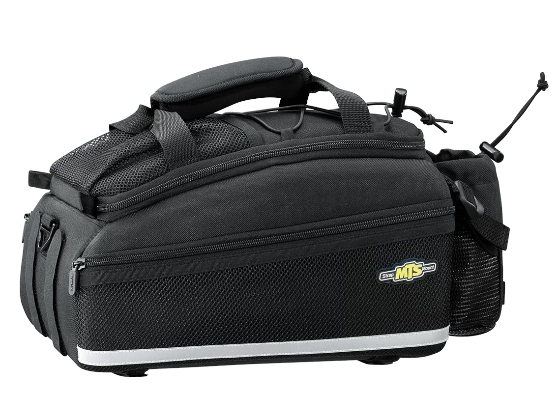 Features a divided main compartment with mesh side compartments and rear water bottle holder. Attaches with integrated straps.
