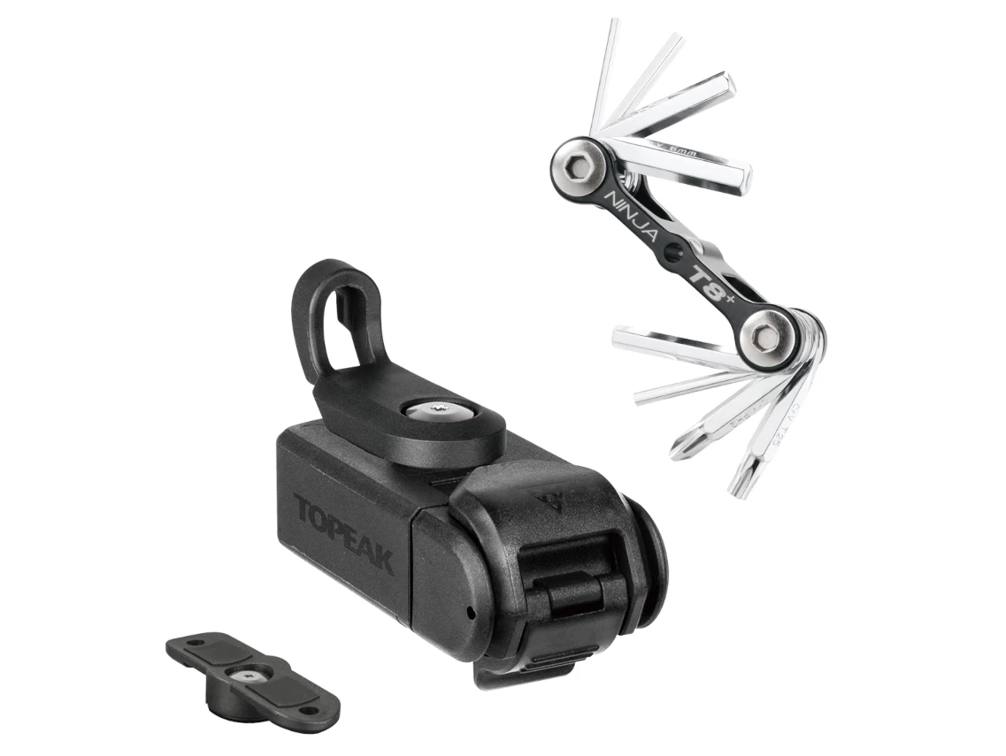 Mounts under Ninja water bottle cage with interchangeable Cage Mount or use alone with Frame Mount.