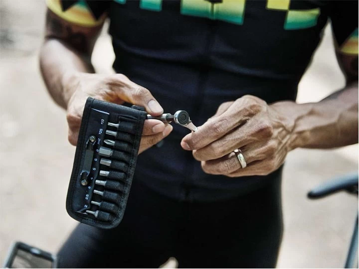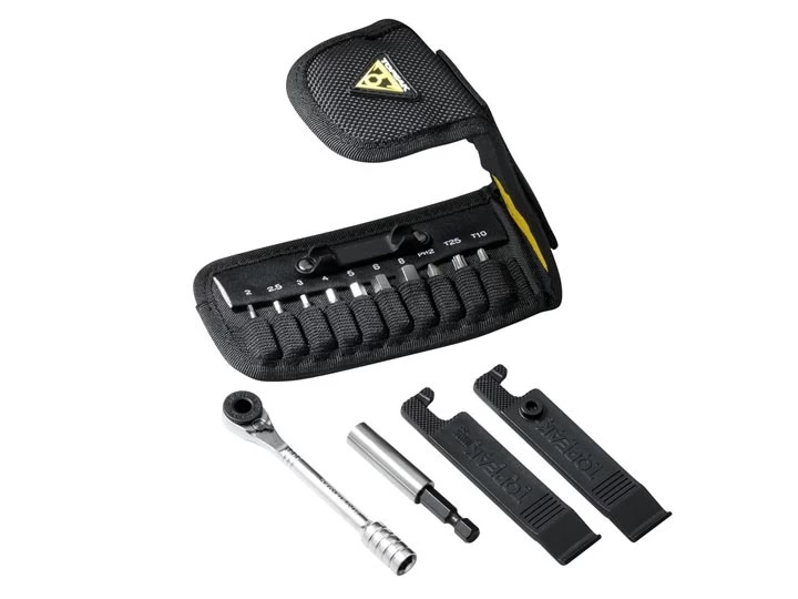 Includes hardened steel tools in 2, 2.5, 3, 4, 5, 6 and 8mm hex, T10, T25 Torx and #2 Phillips bits, 2 plastic tire levers and magnetic bit holder.