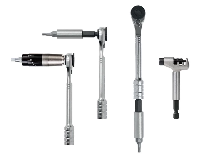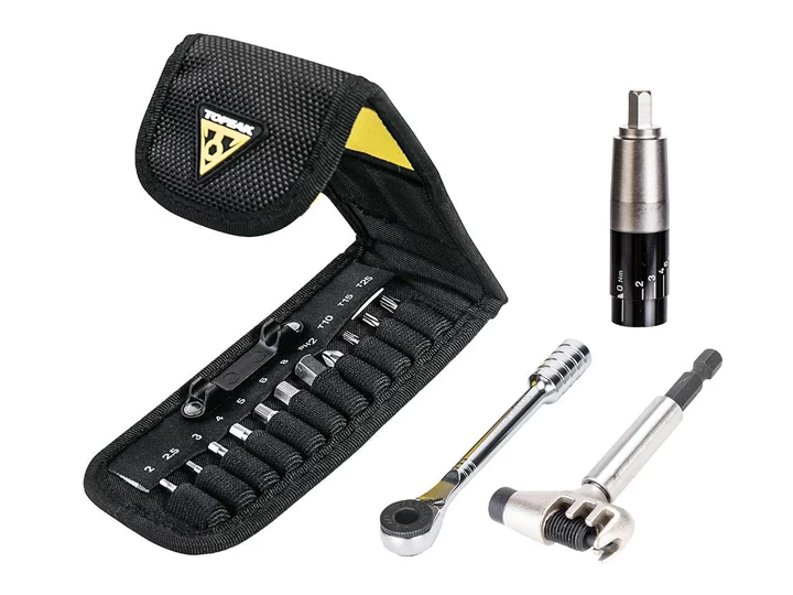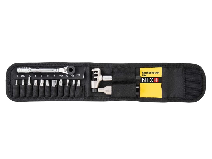 Featuring a fine tooth ratchet mechanism with reverse lever and thumb wheel with adjustable torque TorqBit for ease and accuracy in tight spots. Includes magnetic bit holder, hardened steel tools in 2, 2.5, 3, 4, 5, 6 and 8mm hex, T10, T15, T25 Torx, #2 Phillips bits and CrMo steel chain tool. The protective case keeps things organized and secure, and even has a pocket to carry glueless patches.