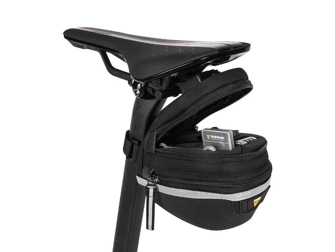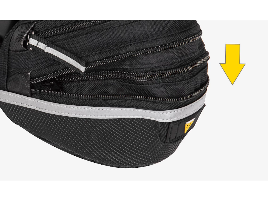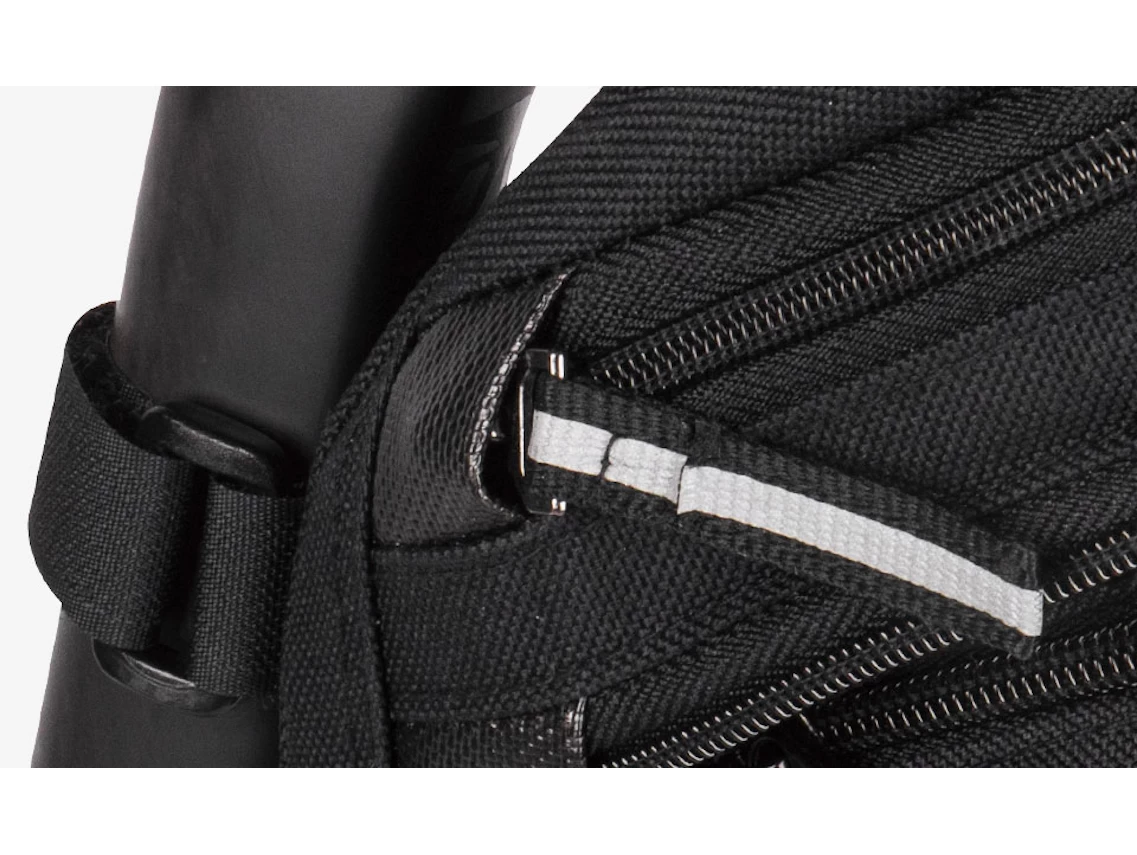Features durable 1000 denier, wrap around zipper, extra long 3M reflective strip for added safety at night and a zippered expanding main compartment for added storage. Mounts and removes quickly with our innovative QuickClick system.