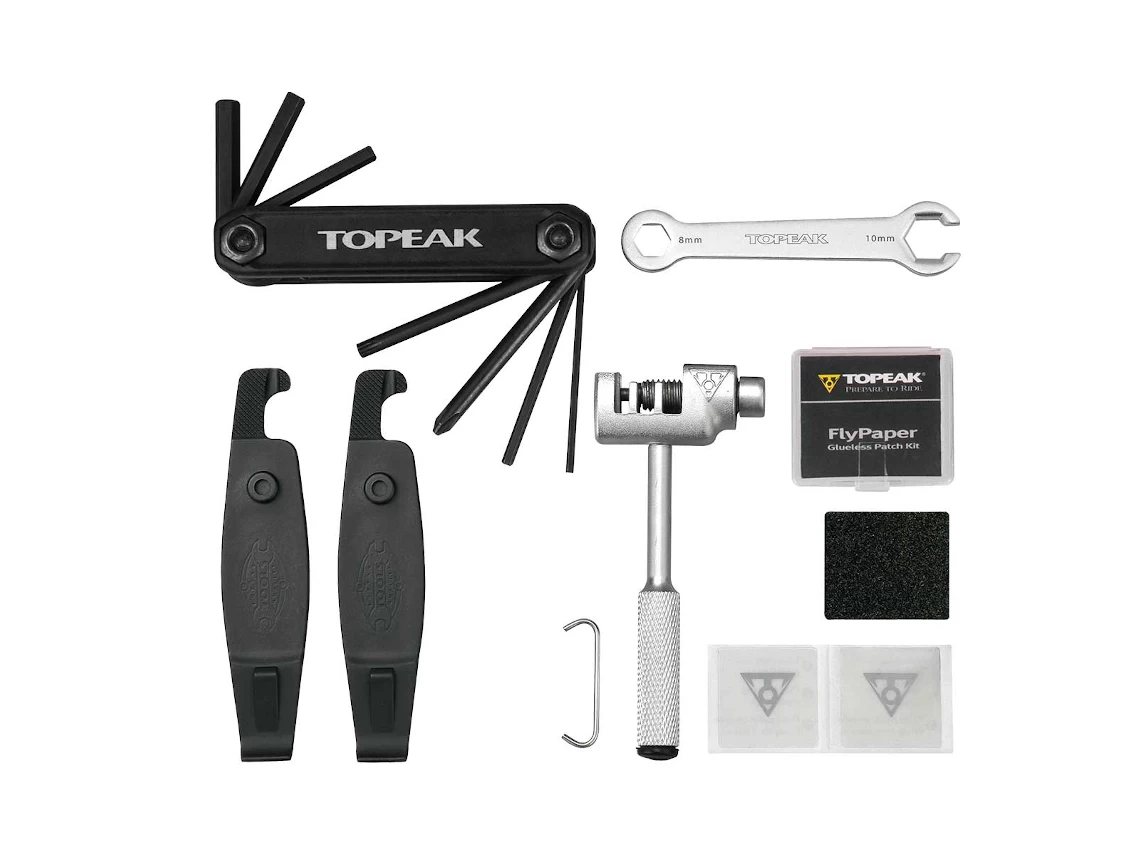 13 function tool kit Includes 2, 3, 4, 5 & 6mm Allen wrenches, T25 Torx wrench, Phillips screw driver, 8 & 10 mm open wrenches, universal chain tool* with chain hook, 2 tire levers & a glueless patch kit.