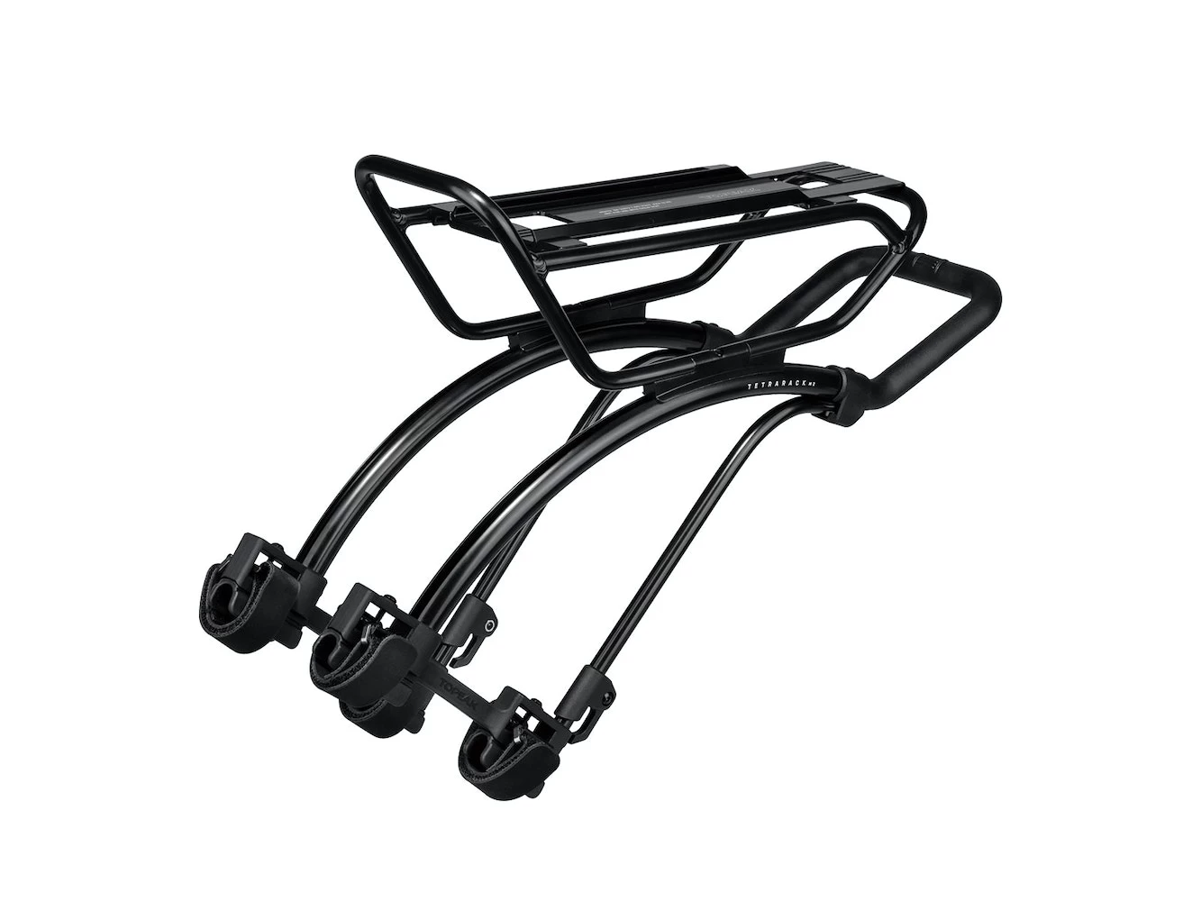 The perfect quick-mount rear rack system attaches to MTB full suspension seatstays or hardtail MTB without rack eyelets. This one-size-fits-all rear rack features an innovative top plate that adjusts to level independent of the seatstay angle. Integrated QuickTrack® system allows Topeak TrunkBags to slide and lock into place and release with a the push of a button. Innovative hook and loop strap mounting system cinches down tight to keep the load stable and allow mounting on a wide range of bikes. Also compatible with KLICKfix® / RackTime® Snapit 1.0 or Vario system bags.