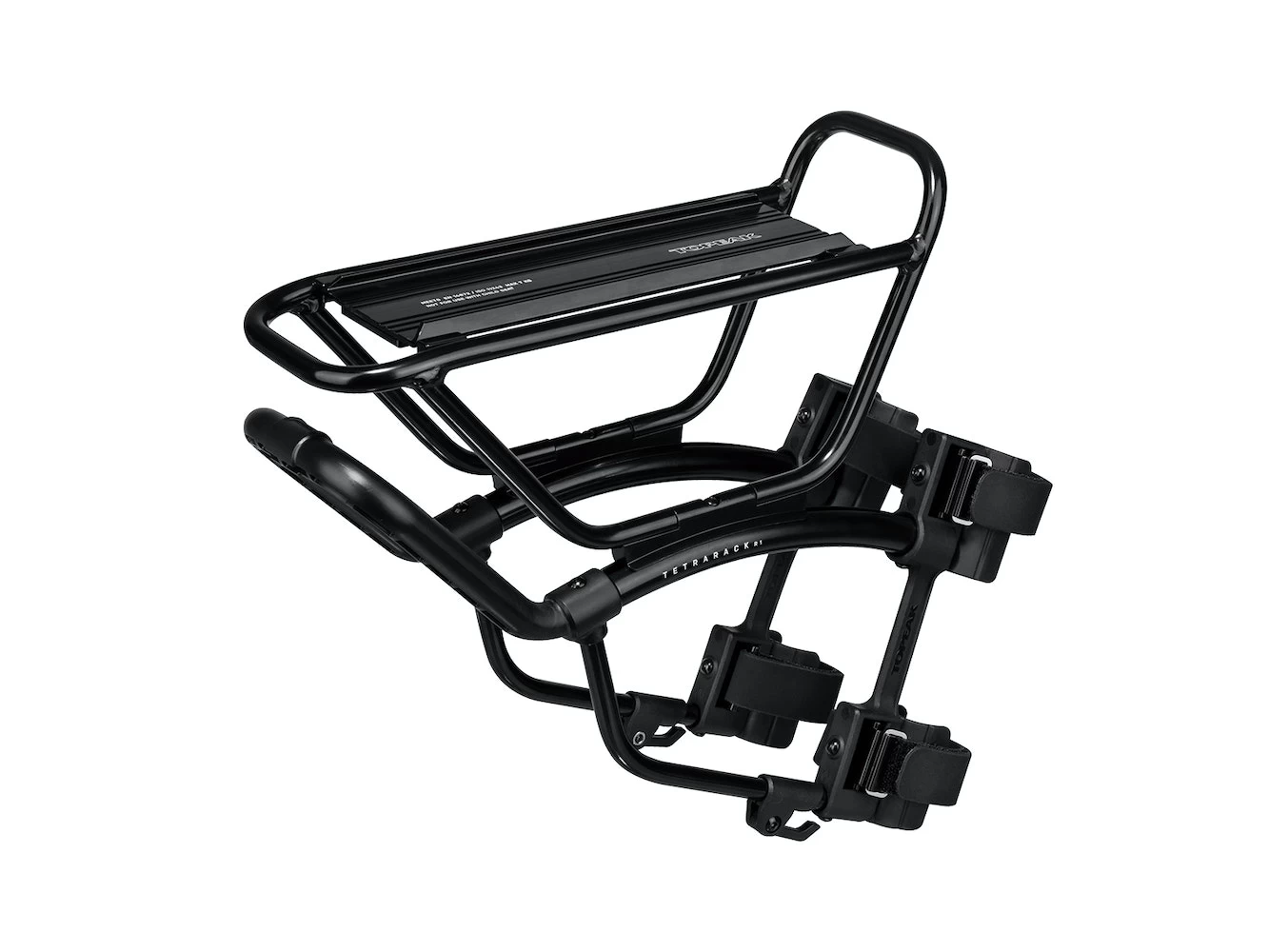 The perfect quick-mount front rack system for road, cross, hybrid or touring bikes with rigid forks. This one-size-fits-all front rack features an innovative top plate that adjusts to level independent the fork angle. Integrated QuickTrack® system allows Topeak TrunkBags to slide and lock into place and release with a the push of a button. Innovative hook and loop strap mounting system cinches down tight to keep the load stable and allow mounting on a wide range of bikes.