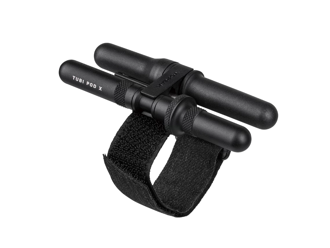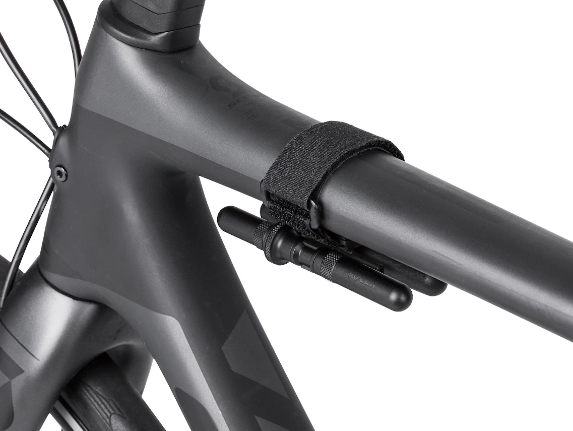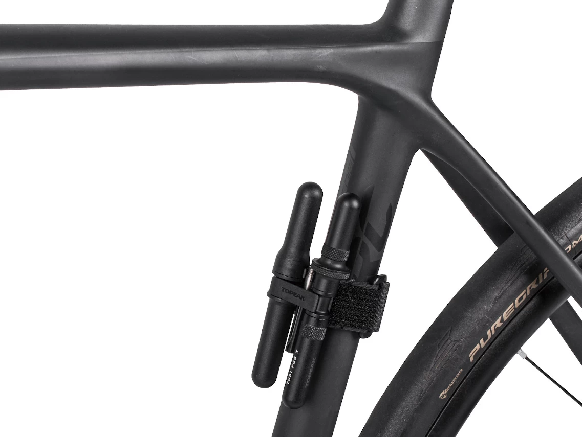 Tubeless repair tools store inside a machined pod while five tyre plugs store in a lightweight polymer pod. Both pods secure to a mounting module that can be strapped to a frame tube or seatpost – ready and waiting for action.