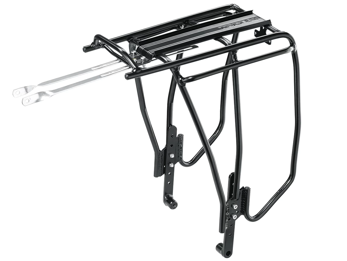 The rack legs are adjustable to fit most 24” & 26” wheel Fat Bikes. The integrated side bar provides a lower pannier attachment point allowing more space for cargo on top of the rack. The MTX QuickTrack plate is compatible with any Topeak MTX TrunkBag, MTX rear basket, and most other rack packs and panniers on the market. Not compatible with asymmetric rearstay design fat bike frames.
