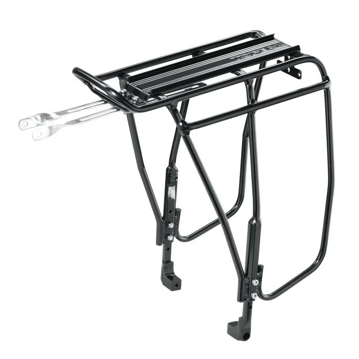 For 24”-29” & 700C Wheels w/ Disc Brakes This one-size-fits-all aluminum tubular rear rack is equipped with adjustable legs to fit most 24” to 29” wheel MTB and 700C touring bikes with disc brakes. This tough tubular rack is designed for heavy-duty, long distance touring. The integrated side bar provides a lower pannier attachment point allowing more space for cargo on top of the rack. The MTX QuickTrack® plate is compatible with any Topeak MTX TrunkBag, MTX rear basket, and most other rack packs and panniers on the market.