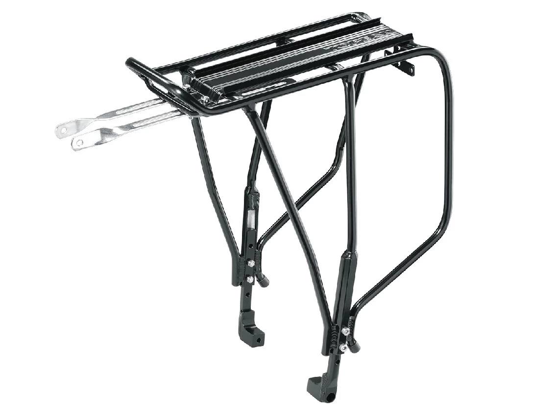 This one-size-fits-all aluminum tubular rear rack is equipped with adjustable legs to fit most 24” to 29” wheel MTB and 700C touring bikes with disc bakes. This durable tubular rack is designed for running errands in town or long distance touring. The MTX QuickTrack plate is compatible with any Topeak MTX TrunkBag, MTX rear basket, and most other rack packs and panniers on the market.