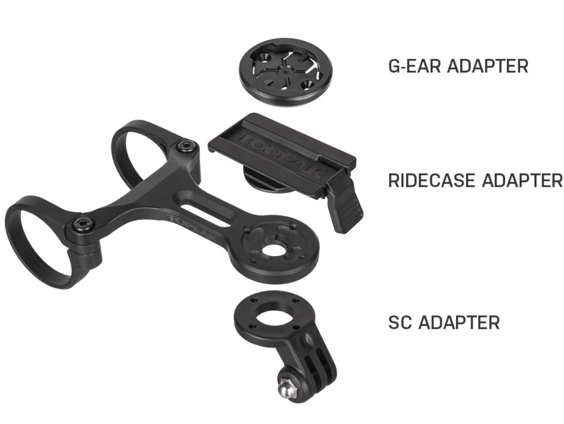 Adapters – These mounts are equipped with G-Ear, RideCase, and SC adapters for cycle computers, Ridecase series cases, Topeak front lights, and sport cameras.